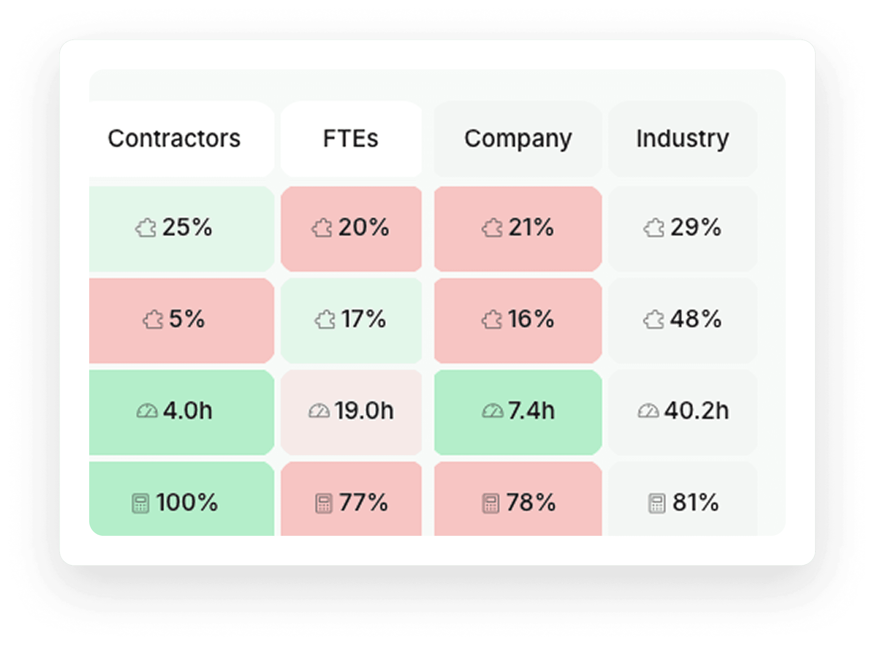 Color-coded scoring (Above/below company & industry)