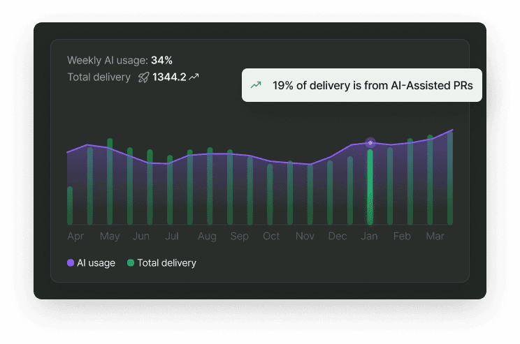 Track how AI-assisted development affects delivery speed, code quality, and team productivity.
