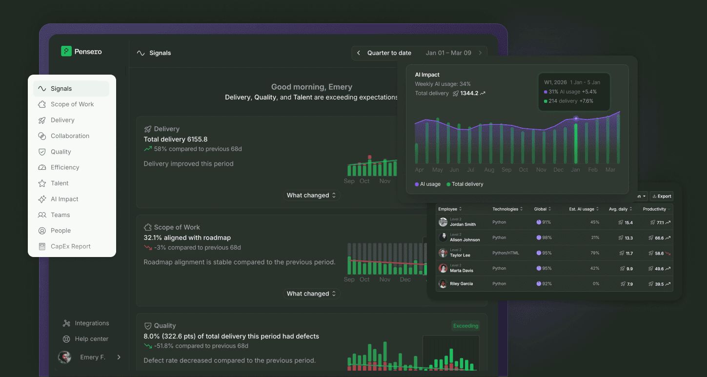 Pensero connects your entire delivery ecosystem and transforms fragmented activity into structured, comparable execution signals.